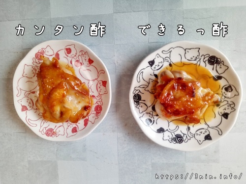 味は「できるっ酢」はさっぱり系、「カンタン酢」は甘め。加熱すると、「カンタン酢」の方が、より酢の角が取れてまろやかに、そしてほのかに旨みが出る気がします。個人的には「カンタン酢」が好みかな。