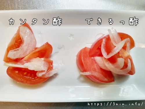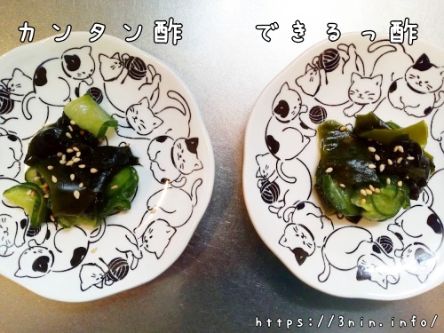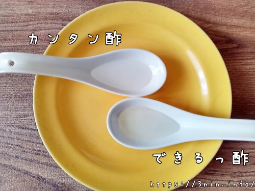 いや、そりゃ「酢」なんだから、すっぱいのは当たり前でしょというツッコミの声が聞こえてきそうですが、なんというか、「なんでもできるっ酢」の方が酢の角が立っている感じ。「カンタン酢」はやや甘めに感じます。