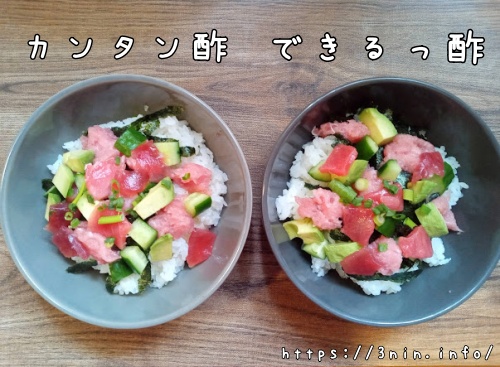 どちらも「すし酢」を使わなくても、混ぜるだけで酢飯ができてとても便利。「カンタン酢」は酸味がマイルドなので、お酢が苦手な人や子ども向きかも。一方、「できるっ酢」は甘み控えめでさっぱりしてます。