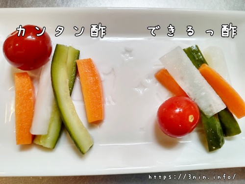 「なんでもできるっ酢」は、漬けて30分でも味がなじんでいるのですが、「カンタン酢」の方は30分だと、まだ素材同士が遠慮してる感じ。クラス替えしたばかりの4月の教室といった味です。カンタン酢は、ちょっとなじませる時間を長くするのがおすすめ。